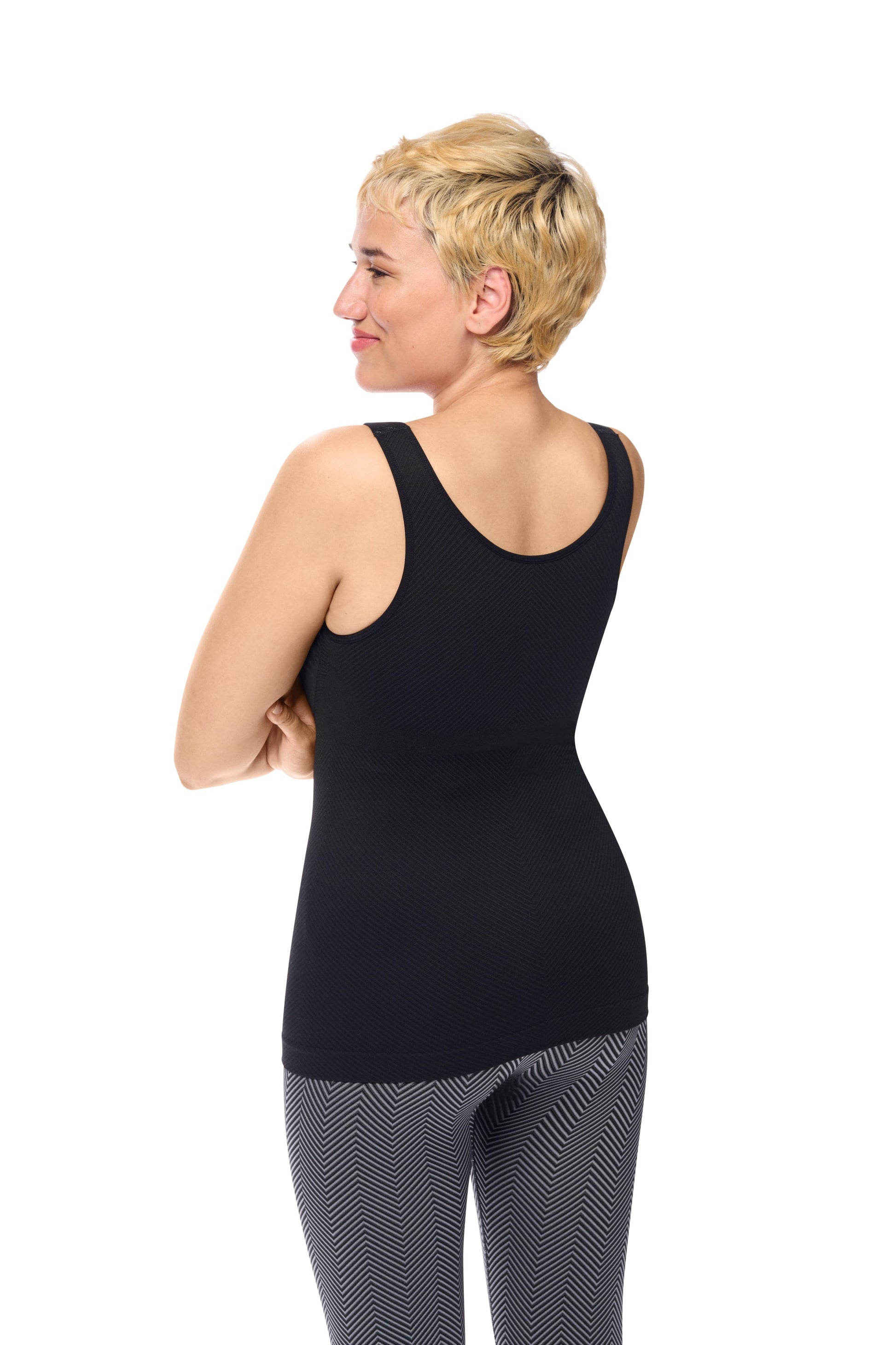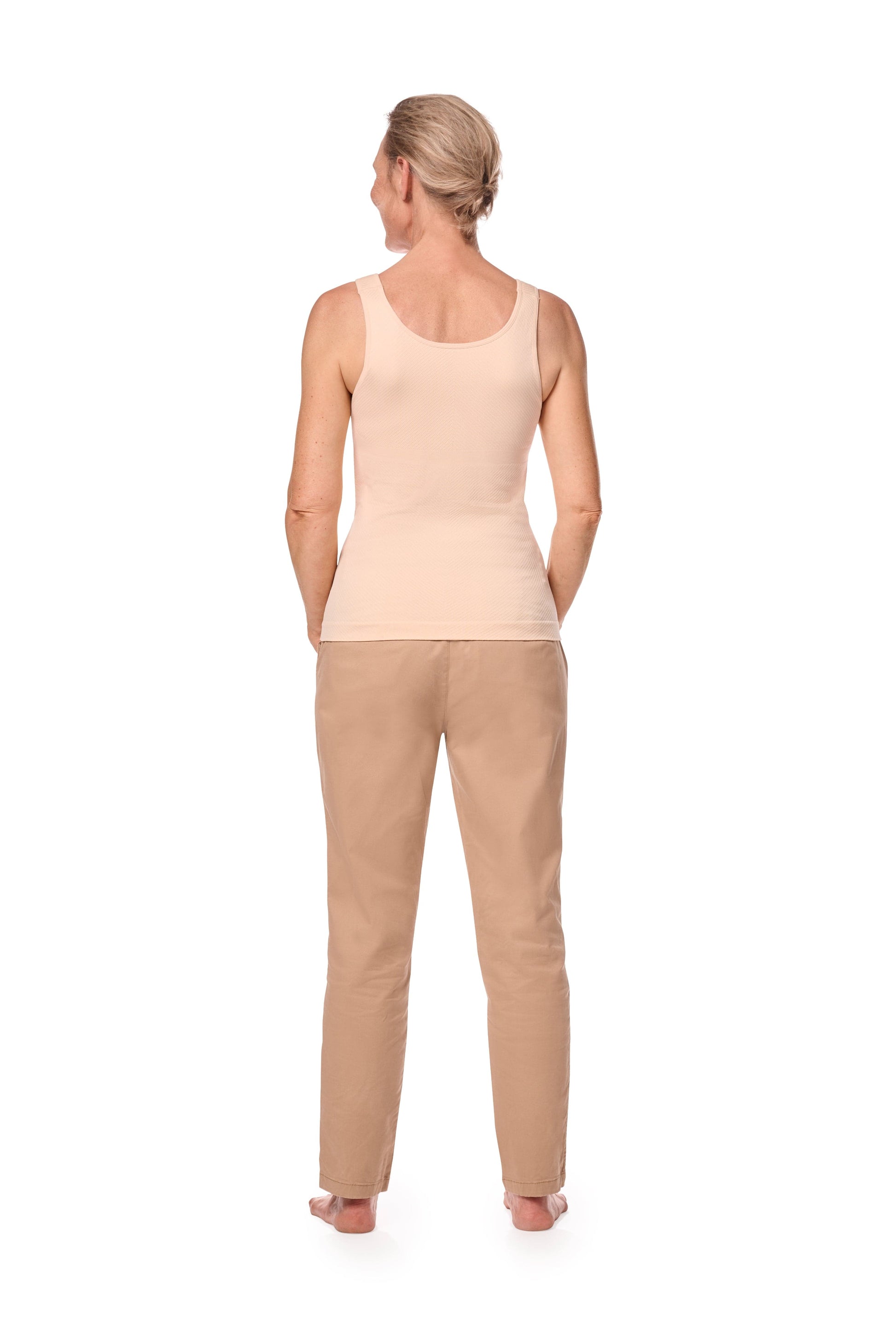 De top heeft brede en gewatteerde schouderbandjes voor hoog draagcomfort en ontlasting van de schouders. De lichte shaping zorgt voor extra draagcomfort bij licht oedeem. De geïntegreerde hoesjes bieden ruimte voor een borstprothese of shaper. De top heeft een heuplengte en een hogere neklijn aan de achterzijde, die extra comfort biedt, insnijdingen voorkomt en de lymfedrainage niet belemmert.
