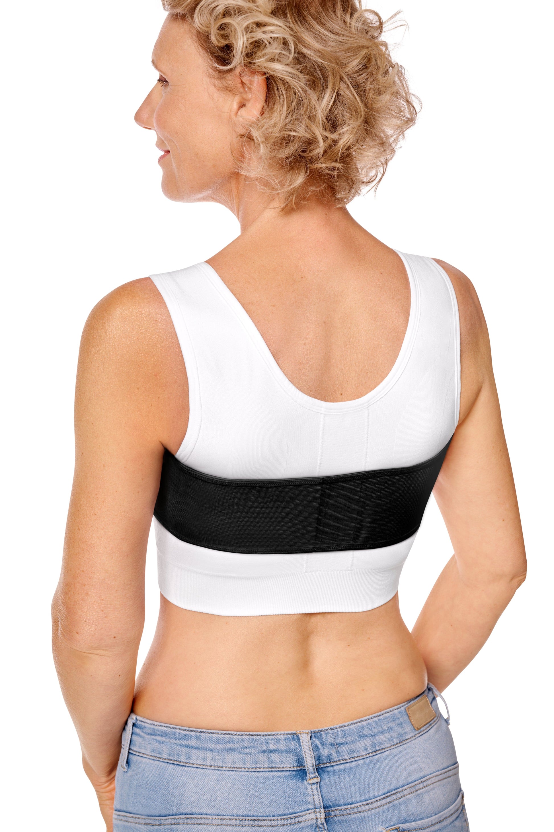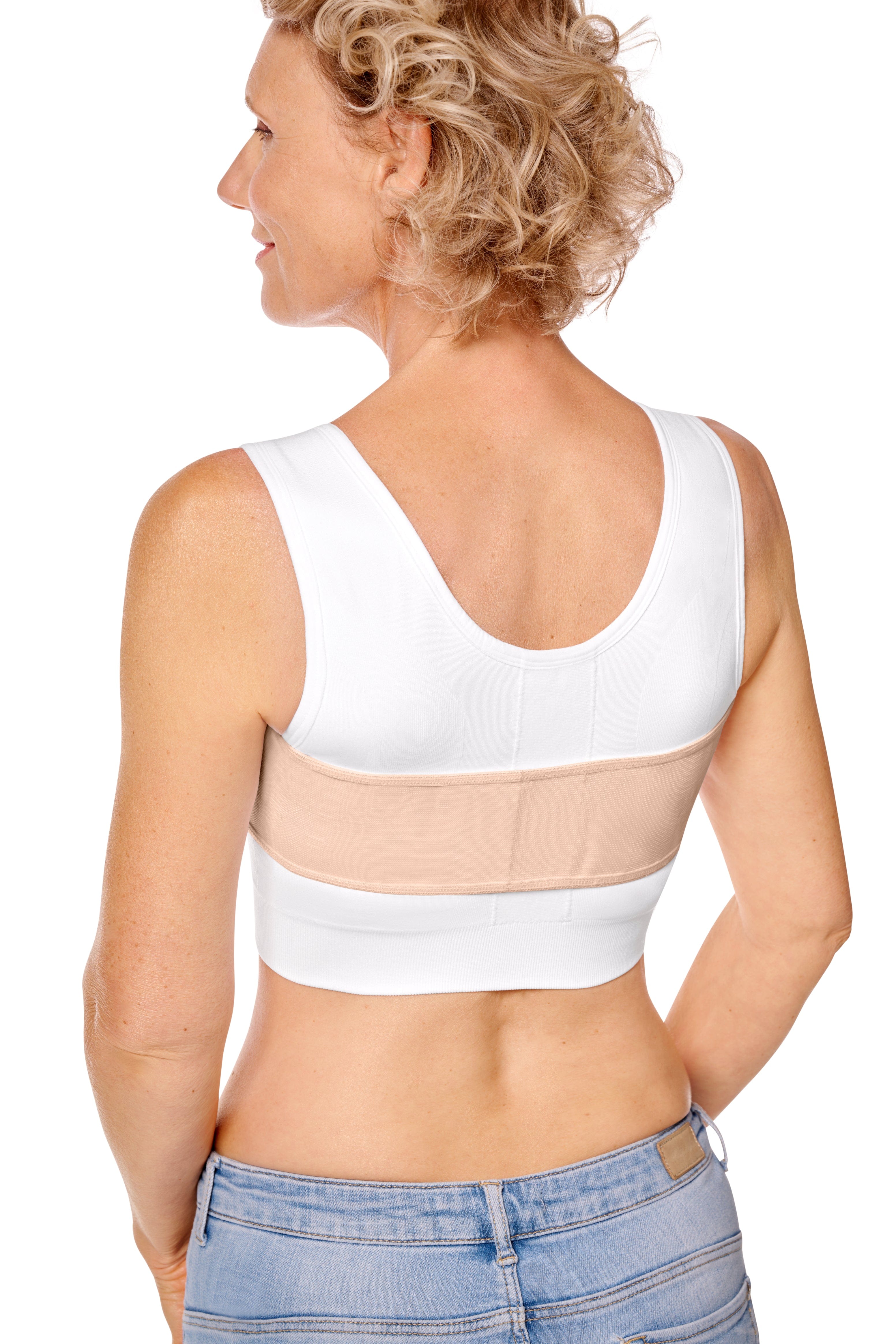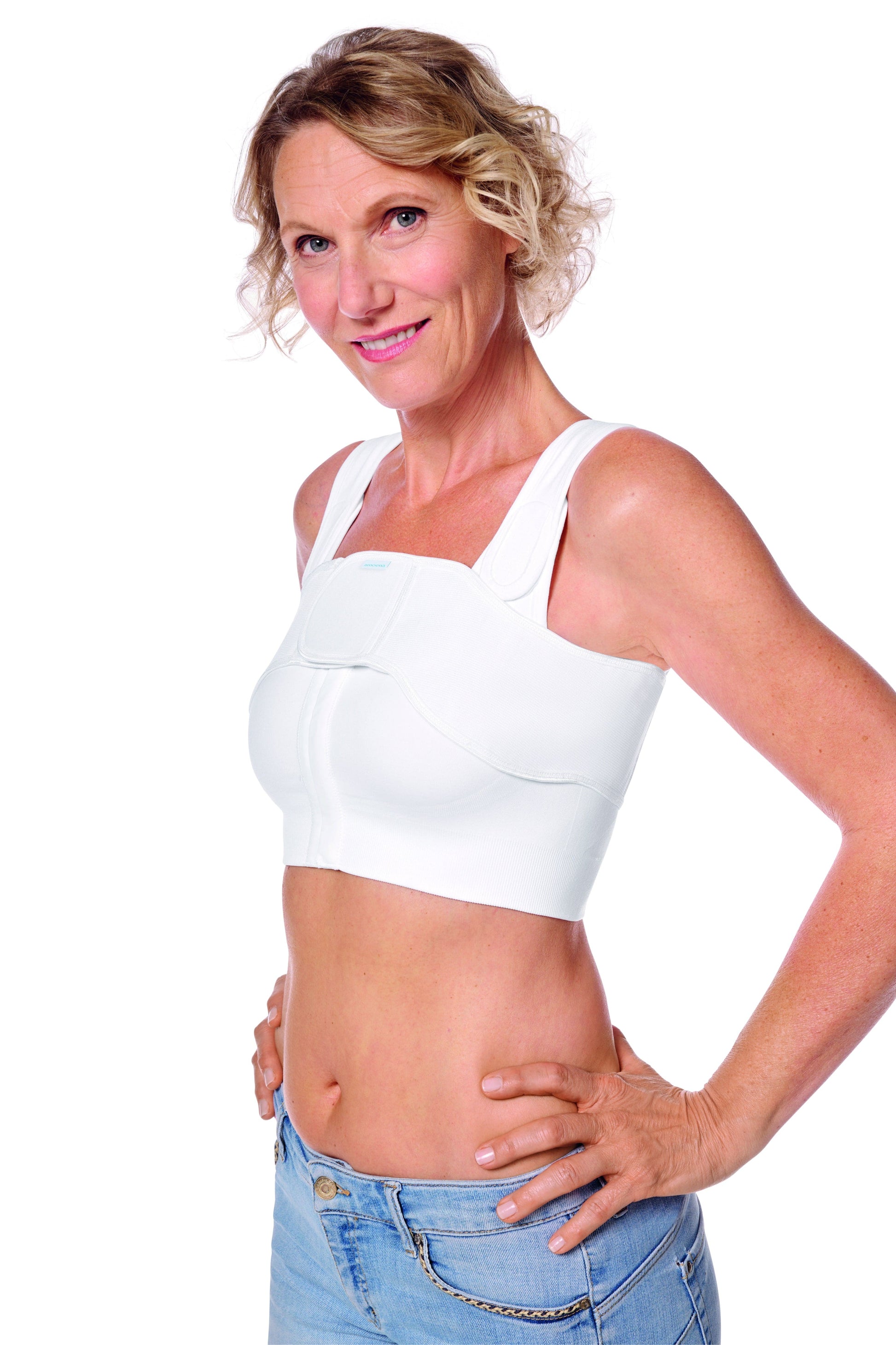 Het vernieuwde anatomische ontwerp volgt nauwgezet de vorm van het bovenlichaam en biedt een gerichte compressie op de bovenborst, inclusief het gevoelige gebied onder de oksel. Gemaakt van rekbare, stevige stof die een perfecte individuele pasvorm mogelijk maakt. Dankzij de zachtere klittenbandsluiting aan de voorzijde kan de compressieband eenvoudig en comfortabel worden aangepast aan het lichaam.