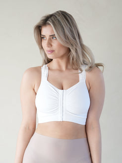 Hoogsluitend decolleté, geïntegreerde versteviging in de cups en de achterzijde van de compressiebeha. Pockets voor tijdelijke protheses. De compressiebeha is verkrijgbaar in de kleuren zwart, wit en beige.