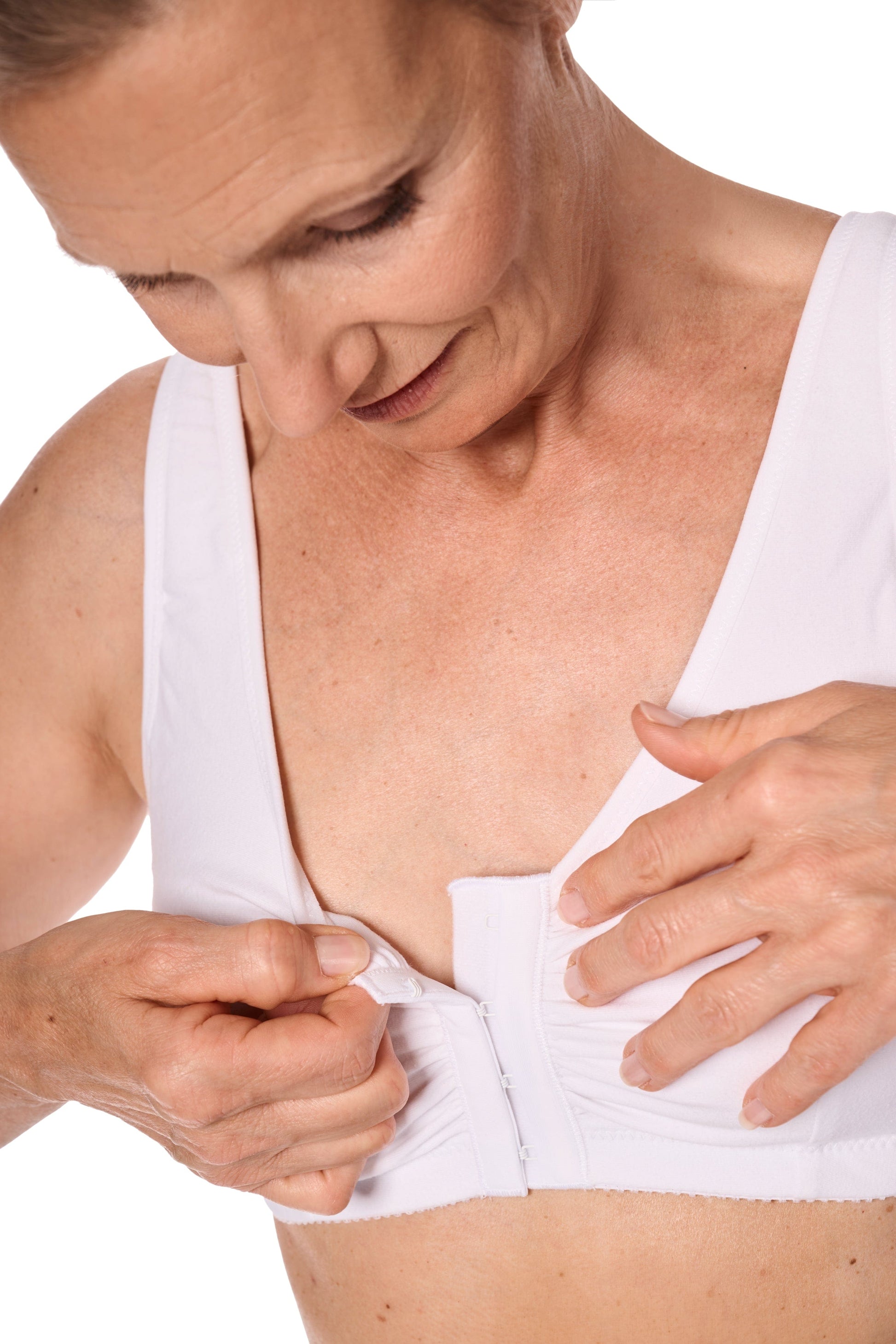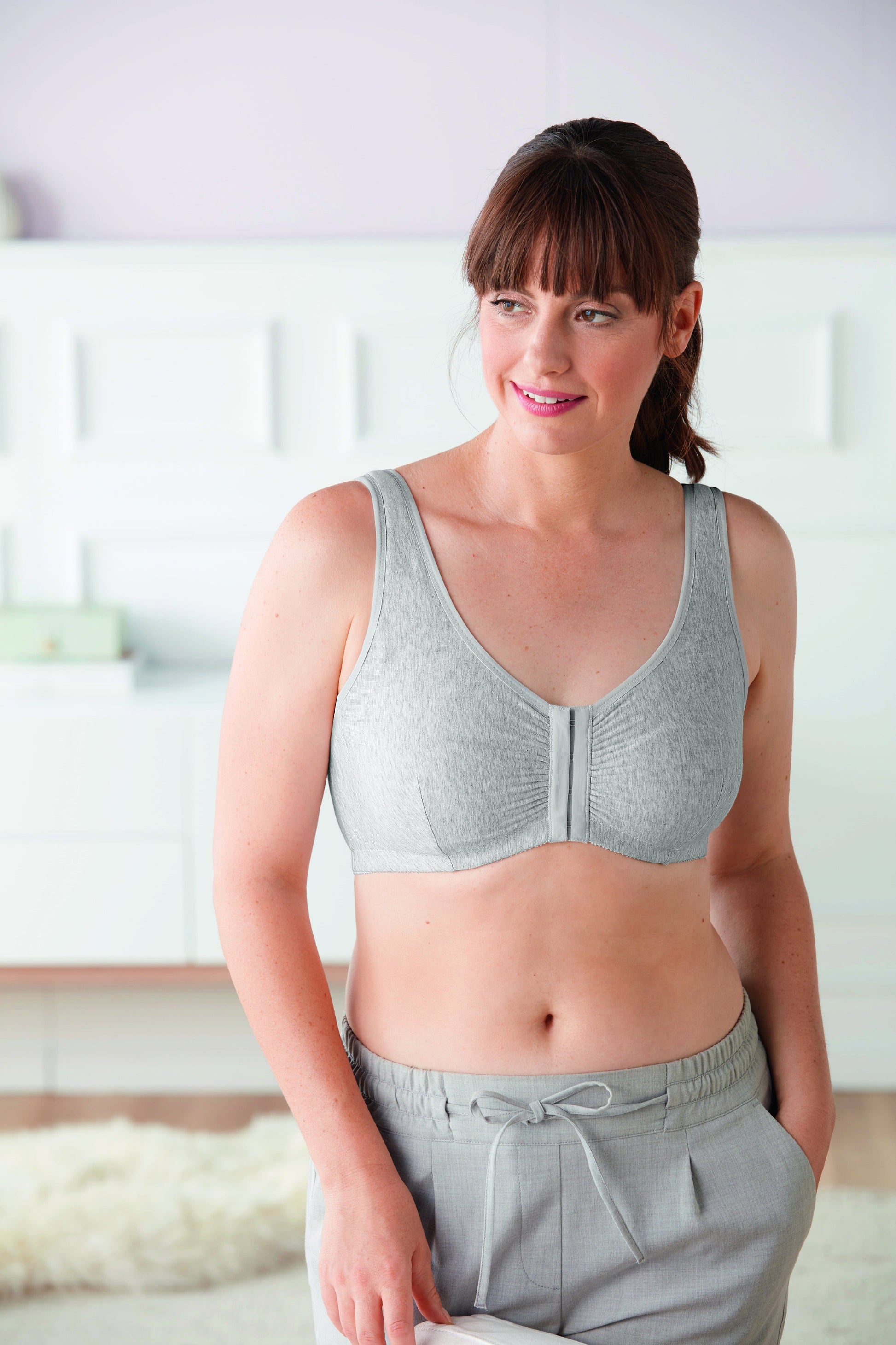 Verkrijgbaar in zwart, zand, wit en grijs. De brede badstof onderband en het achterpand in topmodel zorgen voor extra comfort, zonder knelling of druk. Brede, zachte schouderbandjes met luchtkussentjes ontlasten de schouders en zijn achter verstelbaar. Dankzij de ingebouwde katoenen hoesjes is de beha geschikt voor het dragen van een borstprothese aan één of beide zijden – zowel in de beginfase als voor langdurig gebruik.