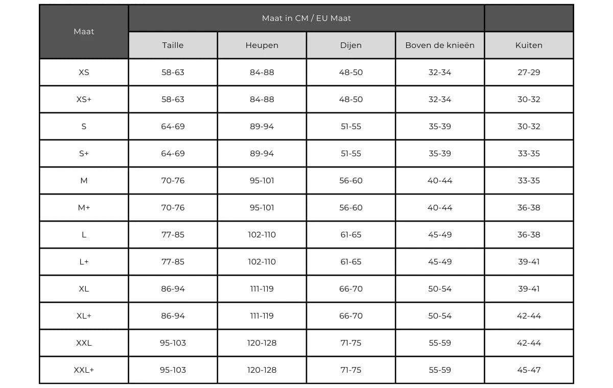 De Active legging is verkrijgbaar in de maten XS t/m XXXL+. In de maattabel kunt u aflezen welke maat het meest geschikt is voor uw omvang.