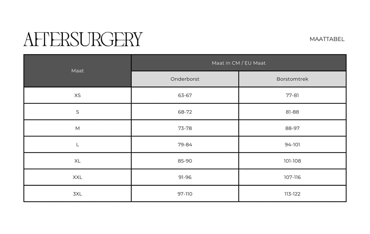 Geschikt voor gebruik in de eerste fase van postoperatieve zorg na borstchirurgie. De compressieband mag alleen worden gedragen op aanbeveling van de chirurg en gedurende een bepaalde periode zoals bepaald door uw plastisch chirurg.