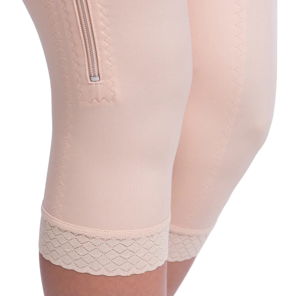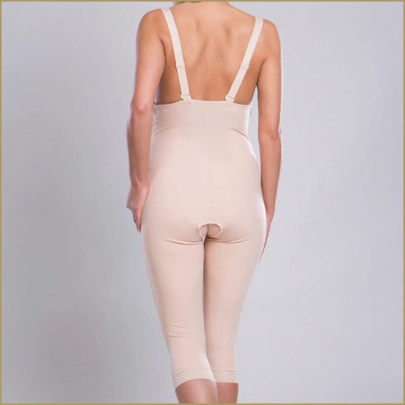 Het compressiekledingstuk komt tot net onder de borst en heeft een smalle zoom met riempjes waaraan u de afneembare en verstelbare schouderbandjes kunt bevestigen. De broekspijpen komen tot onder de knieën en zijn afgewerkt met een zachte kanten zoom. Verkrijgbaar in zwart en beige.