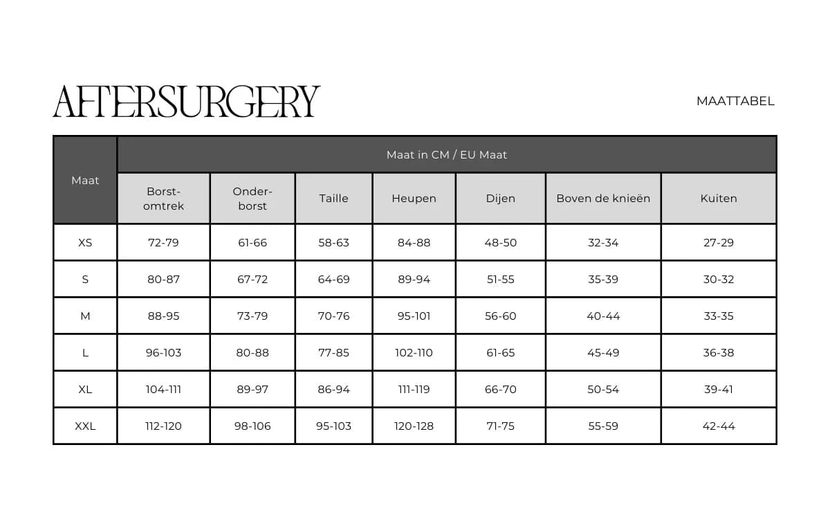 Houd u daarbij rekening met het advies om twee verschillende maten te bestellen. U wordt geadviseerd om een kledingstuk op maat en een kleiner te bestellen dan uw huidige maat. Het is namelijk zo dat u direct na de behandeling zult opzwellen waarom uw confectiemaat toeneemt. Gedurende het genezingsproces neemt het vocht af waardoor uw omvang afneemt.