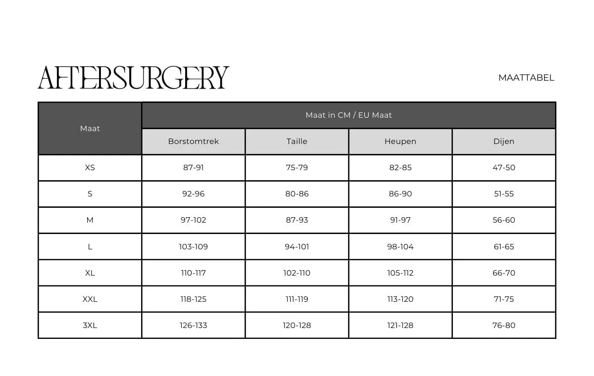 Houd u daarbij rekening met het advies om twee verschillende maten te bestellen. U wordt geadviseerd om een kledingstuk op maat en een kleiner te bestellen dan uw huidige maat. Het is namelijk zo dat u direct na de behandeling zult opzwellen waarom uw confectiemaat toeneemt. Gedurende het genezingsproces neemt het vocht af waardoor uw omvang afneemt.
