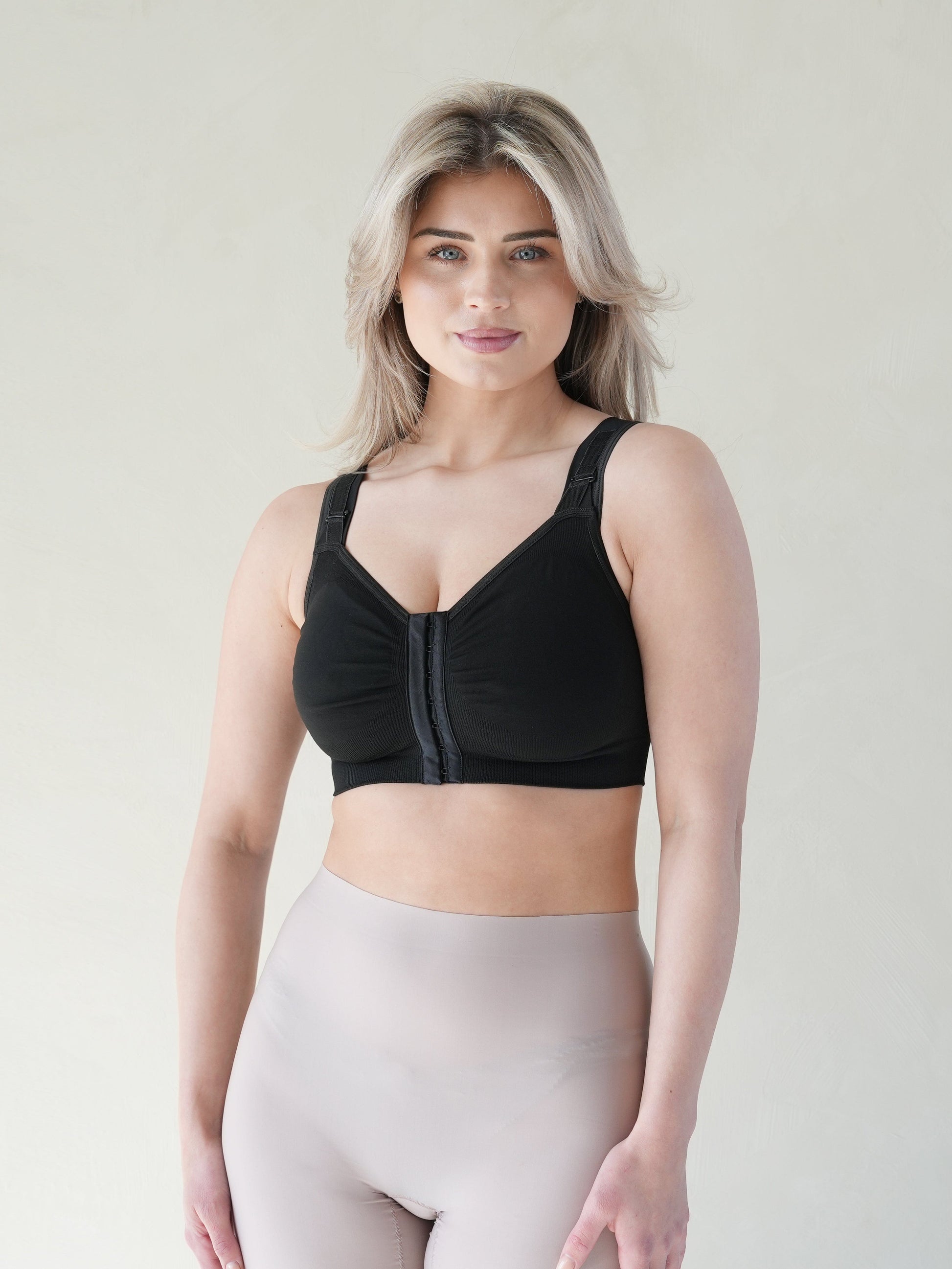 De beha is aan de voorkant voorzien van verstelbare haakjes om het dragen en het aan- en uitdoen van de beha zo makkelijk mogelijk te maken. Hierdoor hoeft u de beha niet op uw rug los te maken, wat onnodige en pijnlijke bewegingen voorkomt. U kunt ook de gewenste druk aanpassen door de schouderbandjes te verstellen.