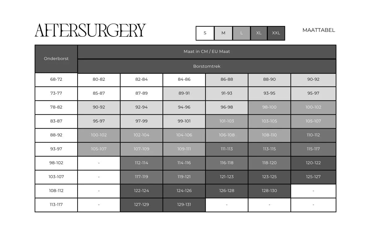 De lipobra is verkrijgbaar in de maten S t/m XXL. In de maattabel kunt u aflezen welke maat het meest geschikt is voor uw omvang.