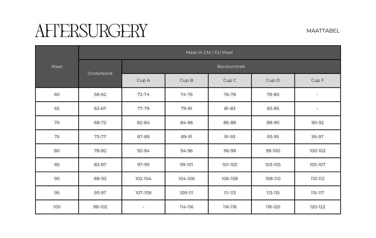 De B16 compressiebeha met cups is verkrijgbaar in de maten 30 AA/A t/m 50 D/E. In de maattabel kunt u aflezen welke maat het meest geschikt is voor uw omvang.
