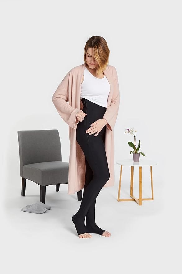 De compressiebroek heeft ritssluitingen aan de zijkant en gevoerde haak- en oogsluitingen, wat het aan- en uittrekken vergemakkelijkt.