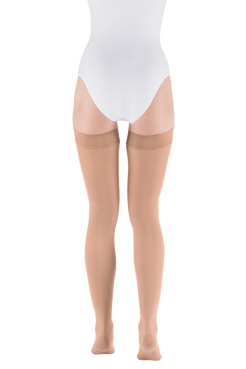 De kous is leverbaar in diverse natuurlijke kleuren. De anatomische pasvorm sluit mooi aan van enkel tot dijbeen. De elastische, zachte dijboord blijft stevig op zijn plaats zitten zonder af te zakken of afdrukken te veroorzaken. Het materiaal voelt soepel aan en biedt een gelijkmatige ondersteuning over het hele been.