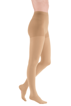 De Mediven® Comfort panty is vervaardigd uit een uitzonderlijk zacht, rondgebreid materiaal dat het aan- en uittrekken vergemakkelijkt. De fijne structuur voelt prettig aan op de huid en biedt extra loop- en draagcomfort dankzij de dubbele breitechniek. Het broekgedeelte (gusset) is anatomisch gevormd en variëert afhankelijk van de maat van een standaard kruisstuk tot een extra brede versteviging voor meer stabiliteit. Het materiaal is ademend, huidvriendelijk en gecertificeerd volgens de OEKO-TEX Standard 100.