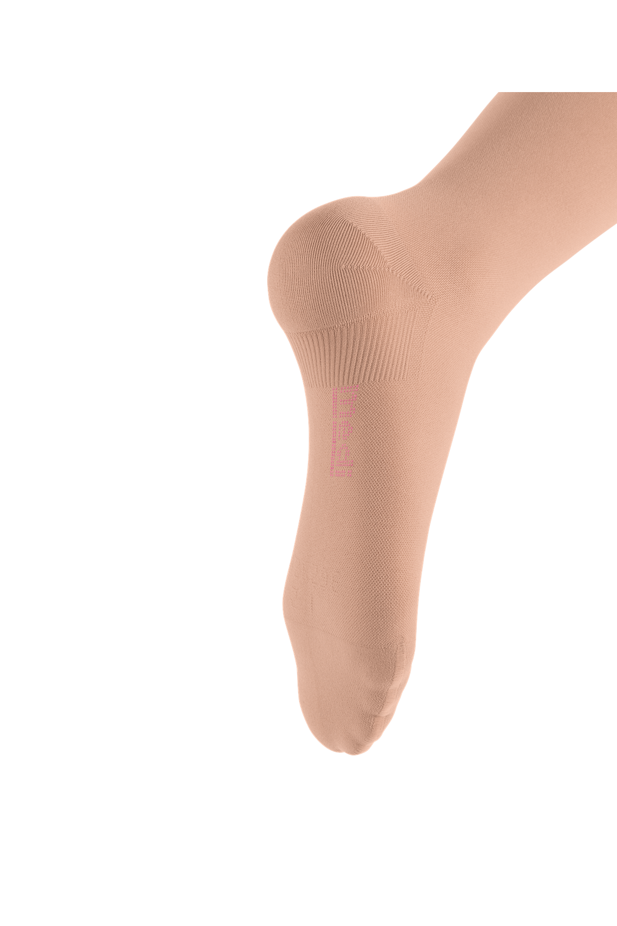 De kous is leverbaar in diverse natuurlijke kleuren. Dankzij de anatomische pasvorm sluit de kous nauw aan van enkel tot dijbeen, met een zachte en stabiele bovenboord die niet afzakt en geen afdrukken veroorzaakt. De stevige structuur zorgt voor een betrouwbare ondersteuning bij lichte tot zwaardere klachten.