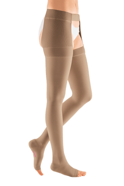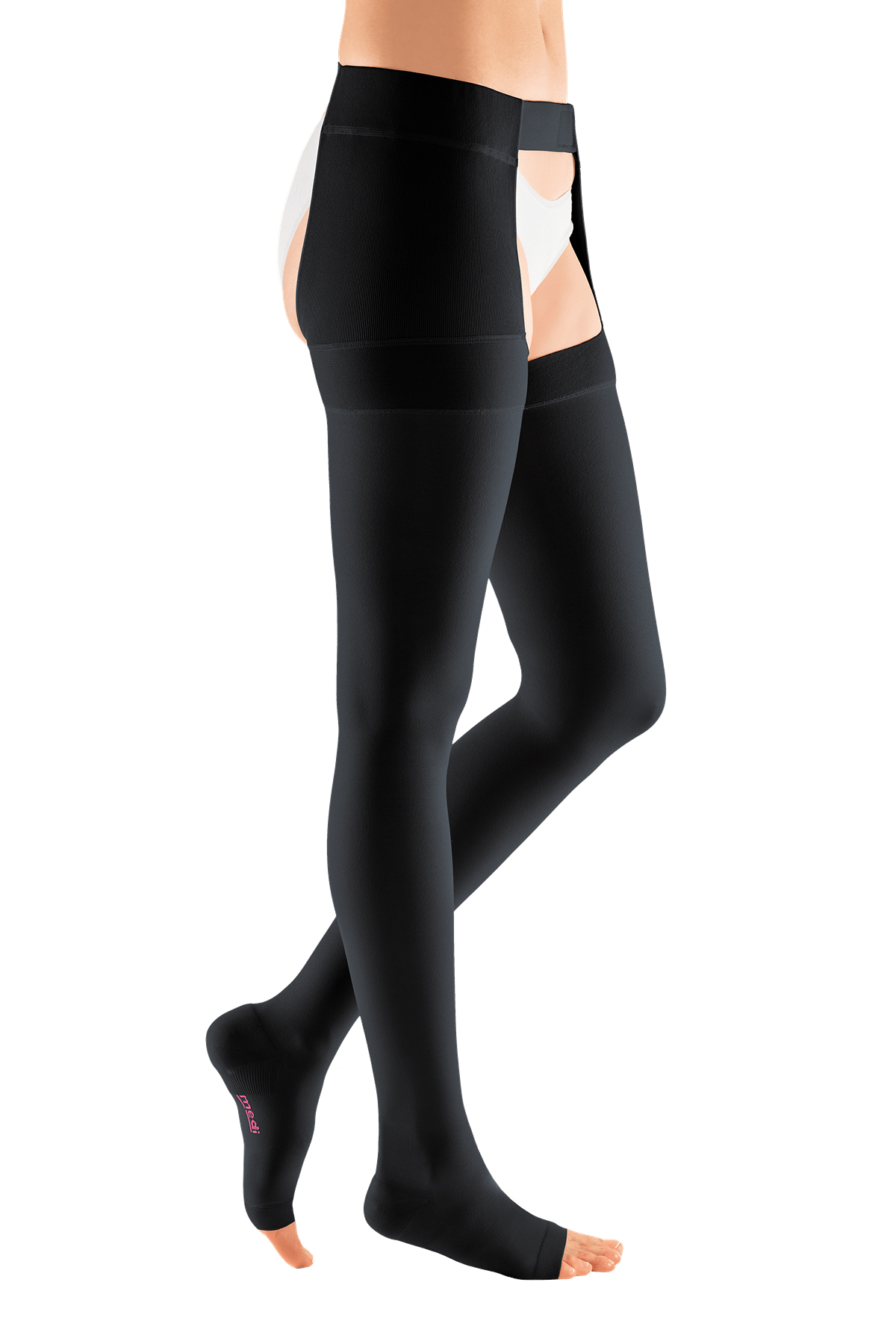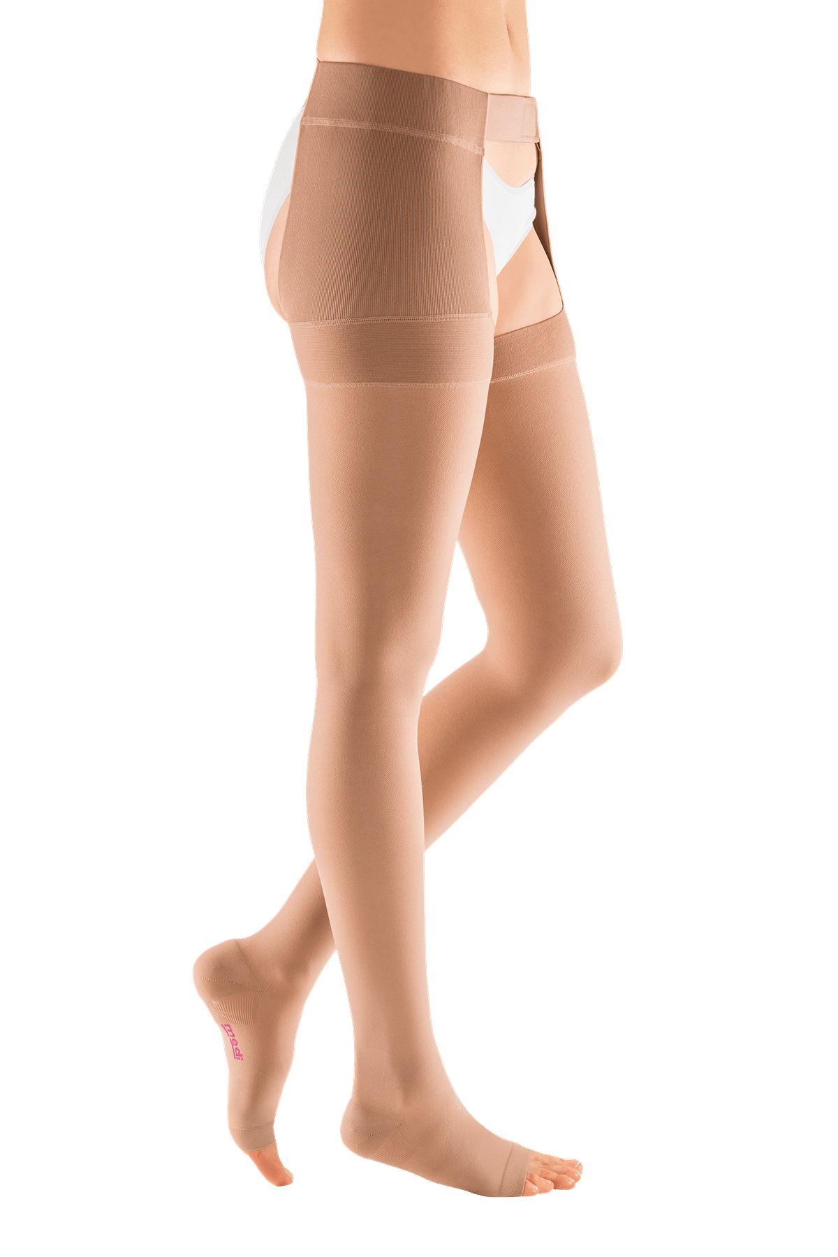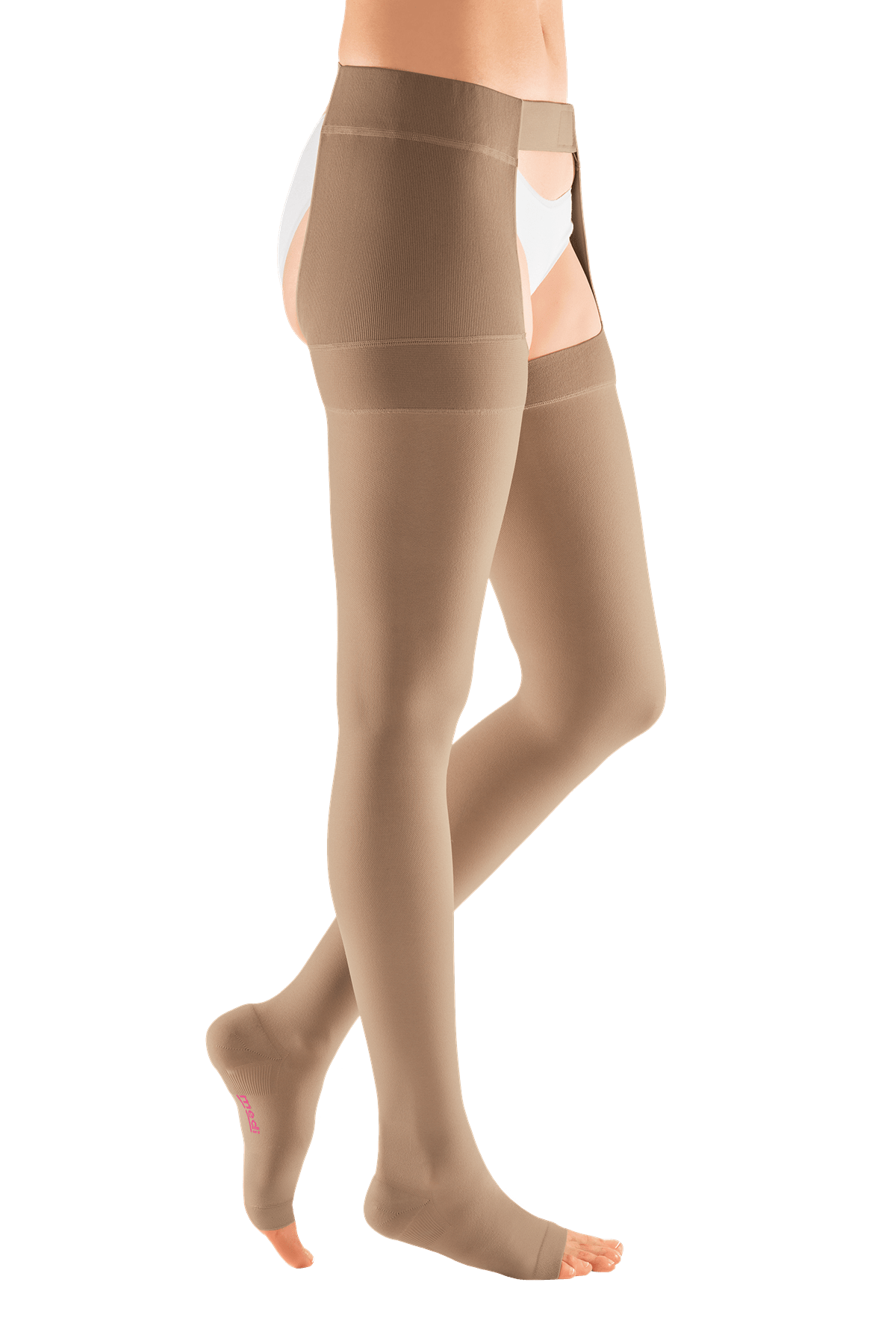 De Mediven® Plus AGT is een dijbeenkous met heupband die wordt gebruikt wanneer compressie aan slechts één been nodig is. Deze kous is ontwikkeld voor de behandeling van veneuze aandoeningen en oedeem tot aan het dijbeen. Dankzij de stevige en stabiele drukverdeling ondersteunt de kous de afvoer van vocht, helpt zij zwelling verminderen en verlicht zij klachten zoals zware, pijnlijke of gespannen benen. De robuuste kwaliteit van de Plus-serie maakt deze variant zeer geschikt voor dagelijks en intensief therapeutisch gebruik.