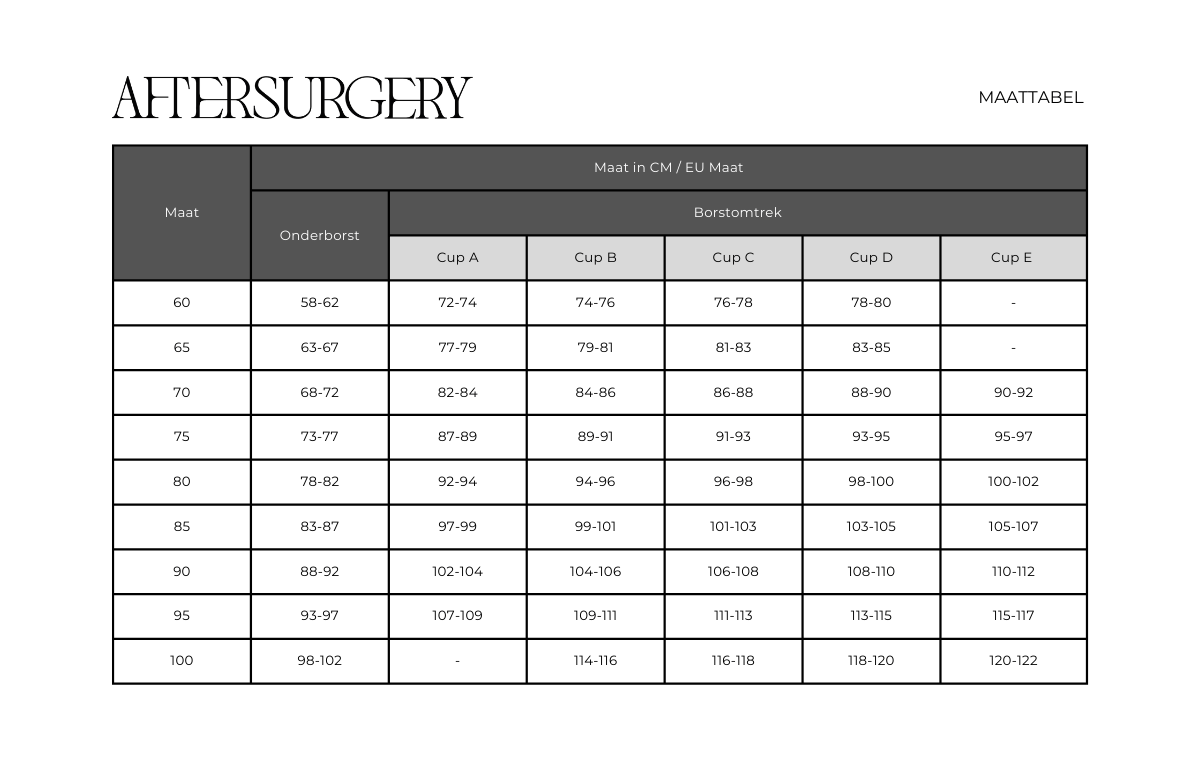 De PSG special is verkrijgbaar in de maten 70A t/m 90C. In de maattabel kunt u aflezen welke maat het meest geschikt is voor uw omvang.